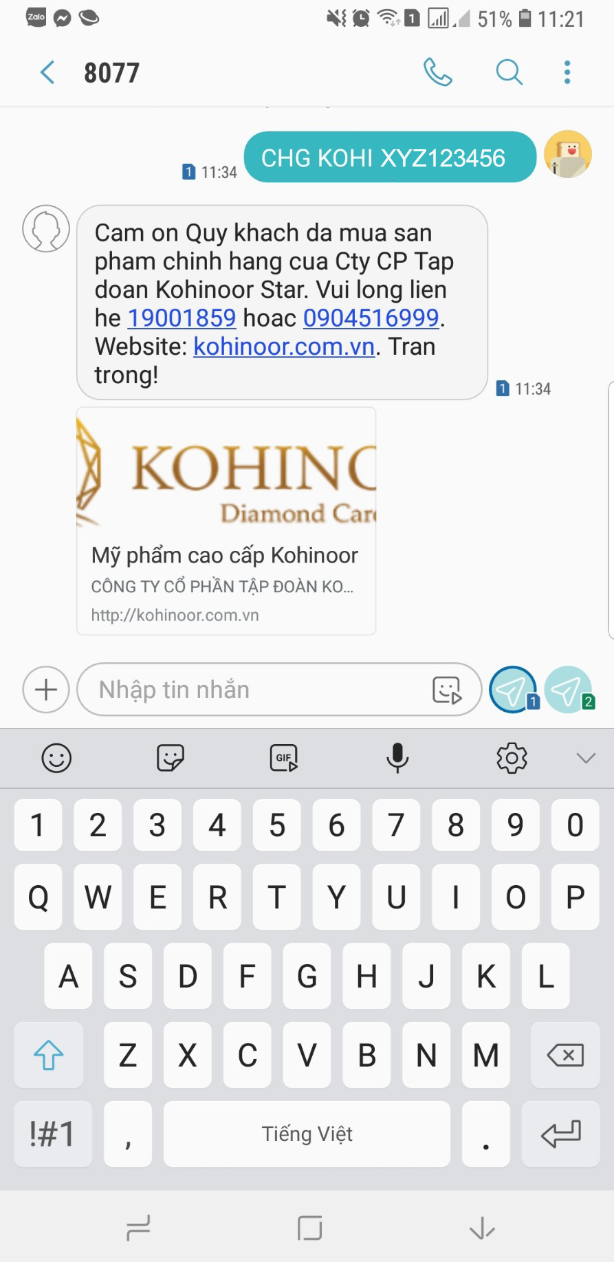 Hệ thống sẽ lập tức báo về tin nhắ rằng bạn đã mua đúng mỹ phẩm Kohinoor chính hãng.