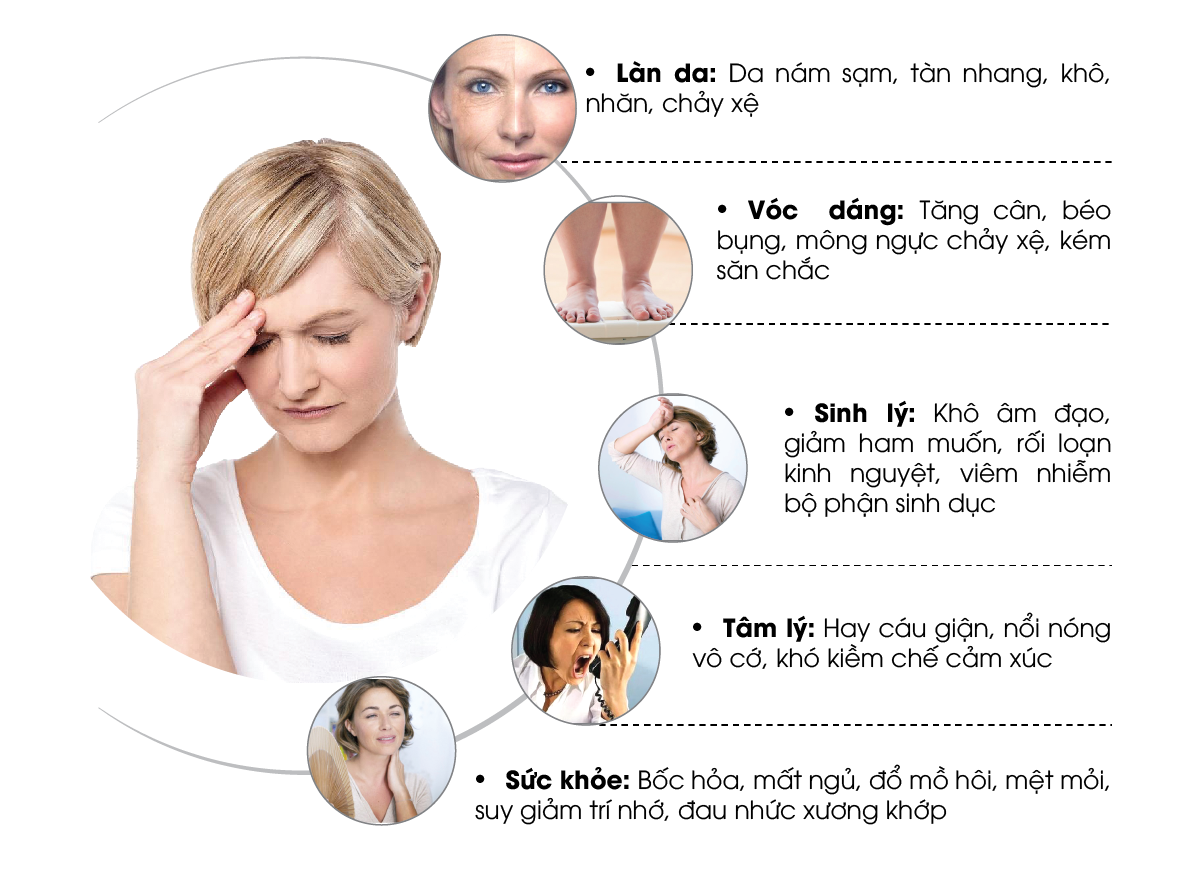 Về sinh lý: Nội tiết tố nữ suy giảm dẫn đến tình trạng khô âm đạo, suy giảm ham muốn tình dục, đau rát khi quan hệ khiến chuyện vợ chồng ngày càng lạnh nhạt.
